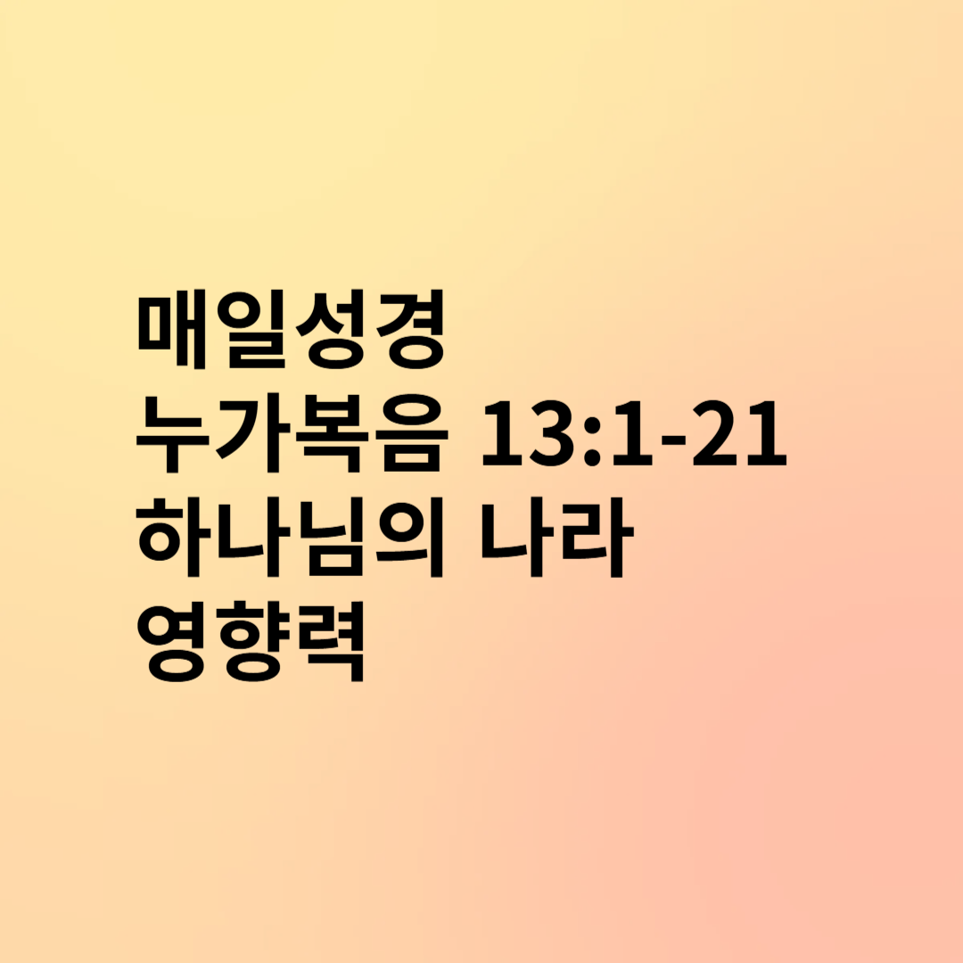"하나님 아버지, 예수님의 말씀처럼 회개 없이는 심판이 있음을 깨닫습니다. 제 삶을 돌아보며 날마다 주님 앞에 회개하게 하시고, 형식적인 신앙이 아니라 열매 맺는 신앙을 살게 하소서. 하나님의 나라는 작은 것에서 시작되지만 결국 모든 것을 변화시키는 것을 믿습니다. 저를 사용하셔서 하나님의 나라 확장에 동참하게 하시고, 복음의 영향력을 넓혀가게 하소서. 예수님의 이름으로 기도합니다. 아멘."