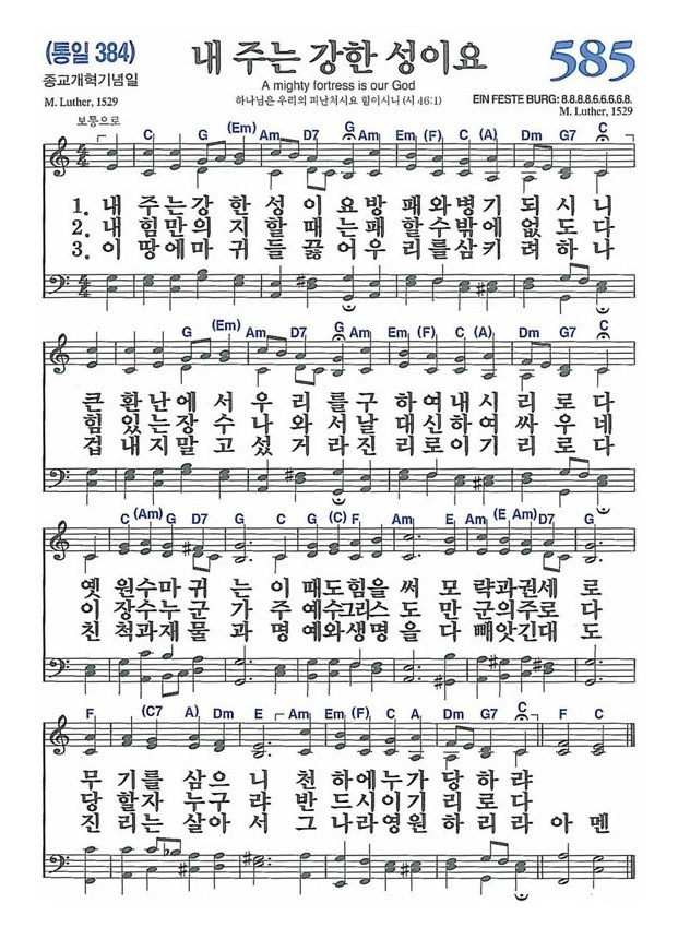 🎵 "내 주는 강한 성이요 방패와 병기 되시니, 큰 환난에서 우리를 구하여 내시리로다!"