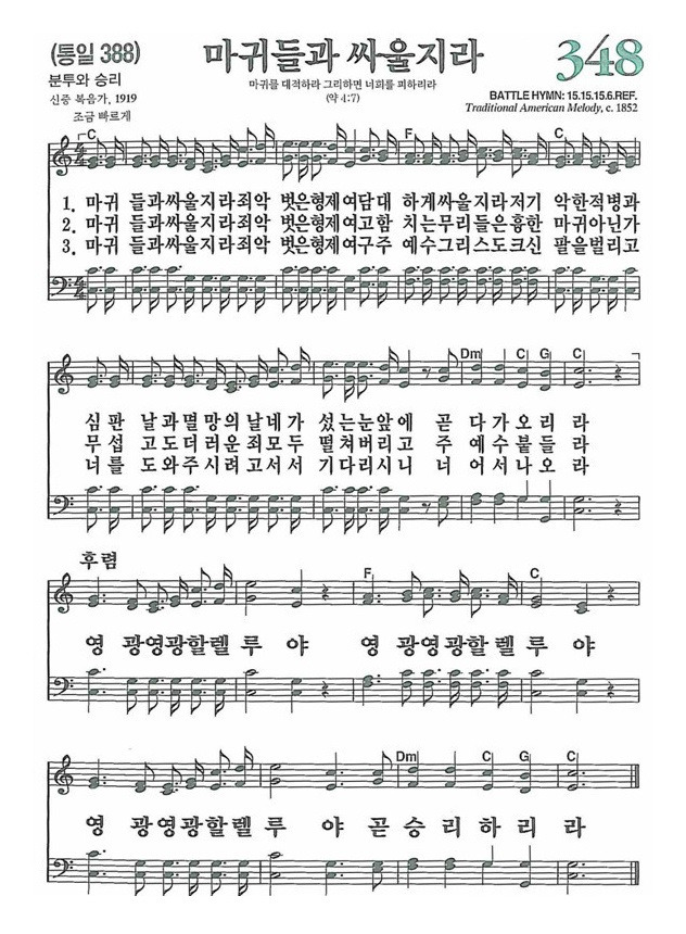 이 찬송은 오늘날에도 성도들에게 영적 전쟁에 대한 각성을 주며, 믿음의 승리를 확신하도록 격려합니다. 신앙의 길을 가면서 낙심하지 말고, 하나님의 전신갑주를 입고 끝까지 싸워 승리하는 군병이 됩시다.